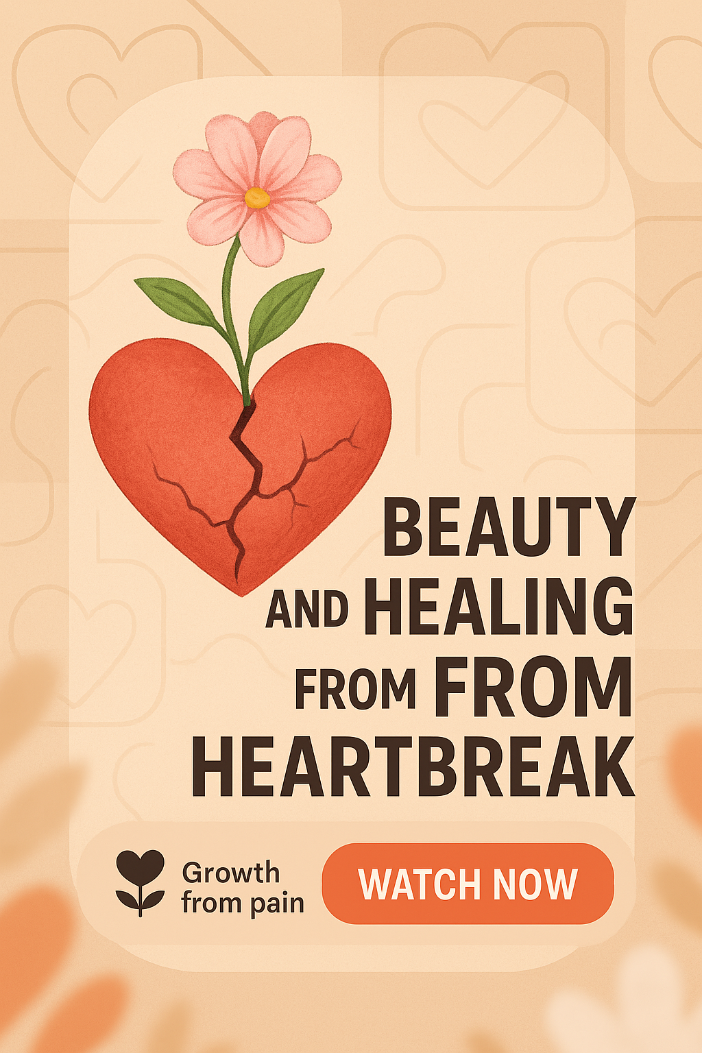 A promotional graphic featuring a cracked heart with a flower, symbolizing healing and growth from heartbreak. Ideal for emotional wellness campaigns.
