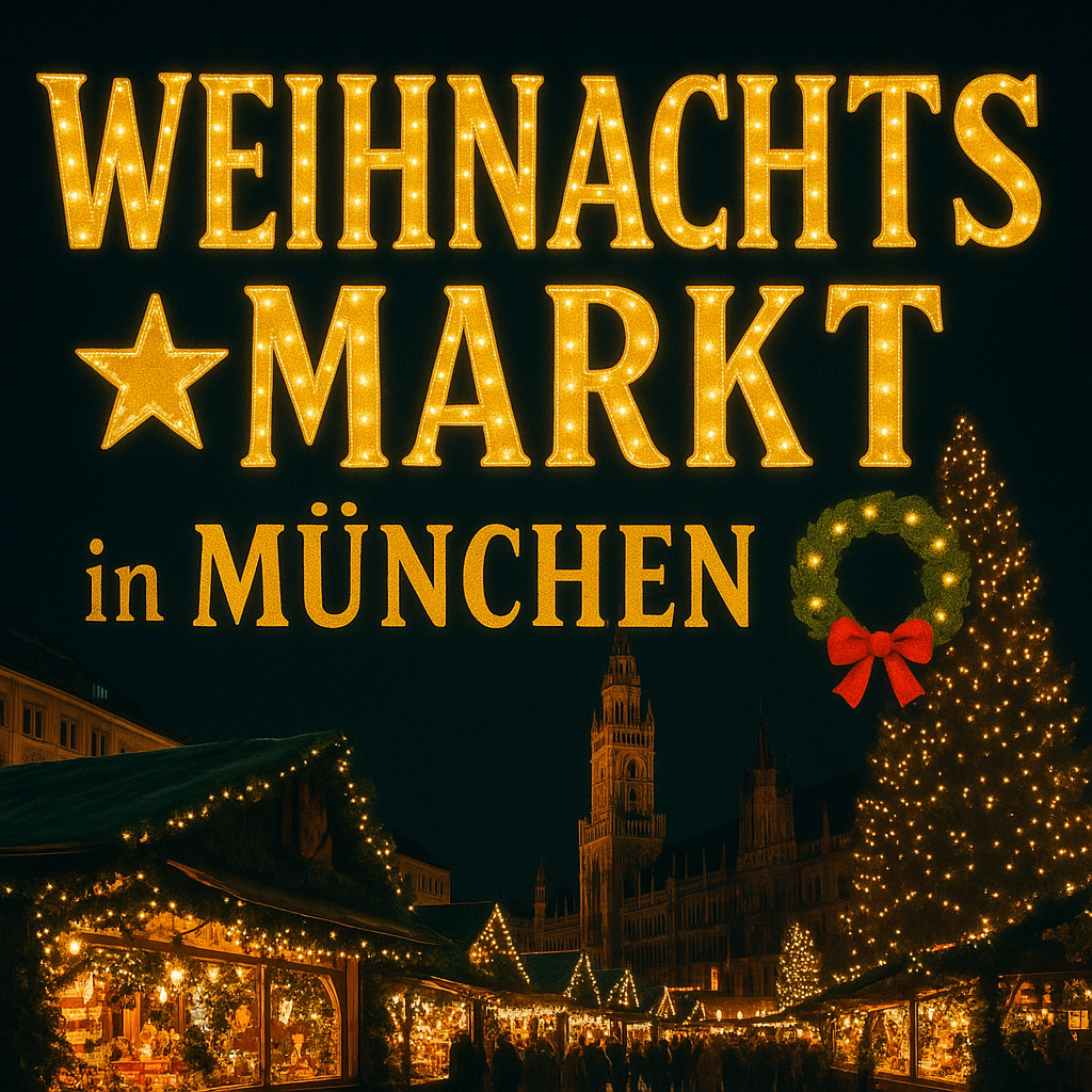 Festive promotional image featuring a Christmas market scene in Munich, adorned with lights and decorations. Ideal for holiday marketing and event promotion.