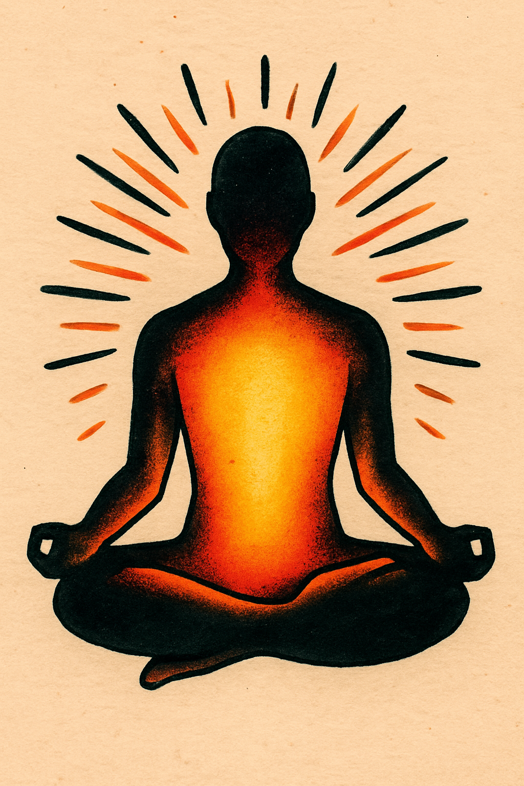 /Collection: /by davooda/Type: PNG/A striking tattoo design featuring a glowing silhouette of a meditating figure. The figure's back radiates warm colors against a light beige background, surrounded by vibrant rays.