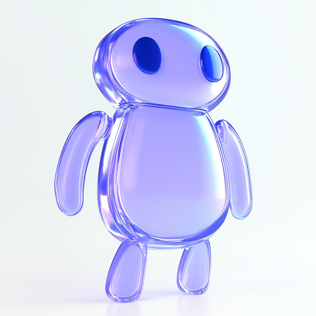 A stylized 3D rendered character of a transparent robot with a glossy finish, perfect for showcasing modern technology themes and digital design concepts.