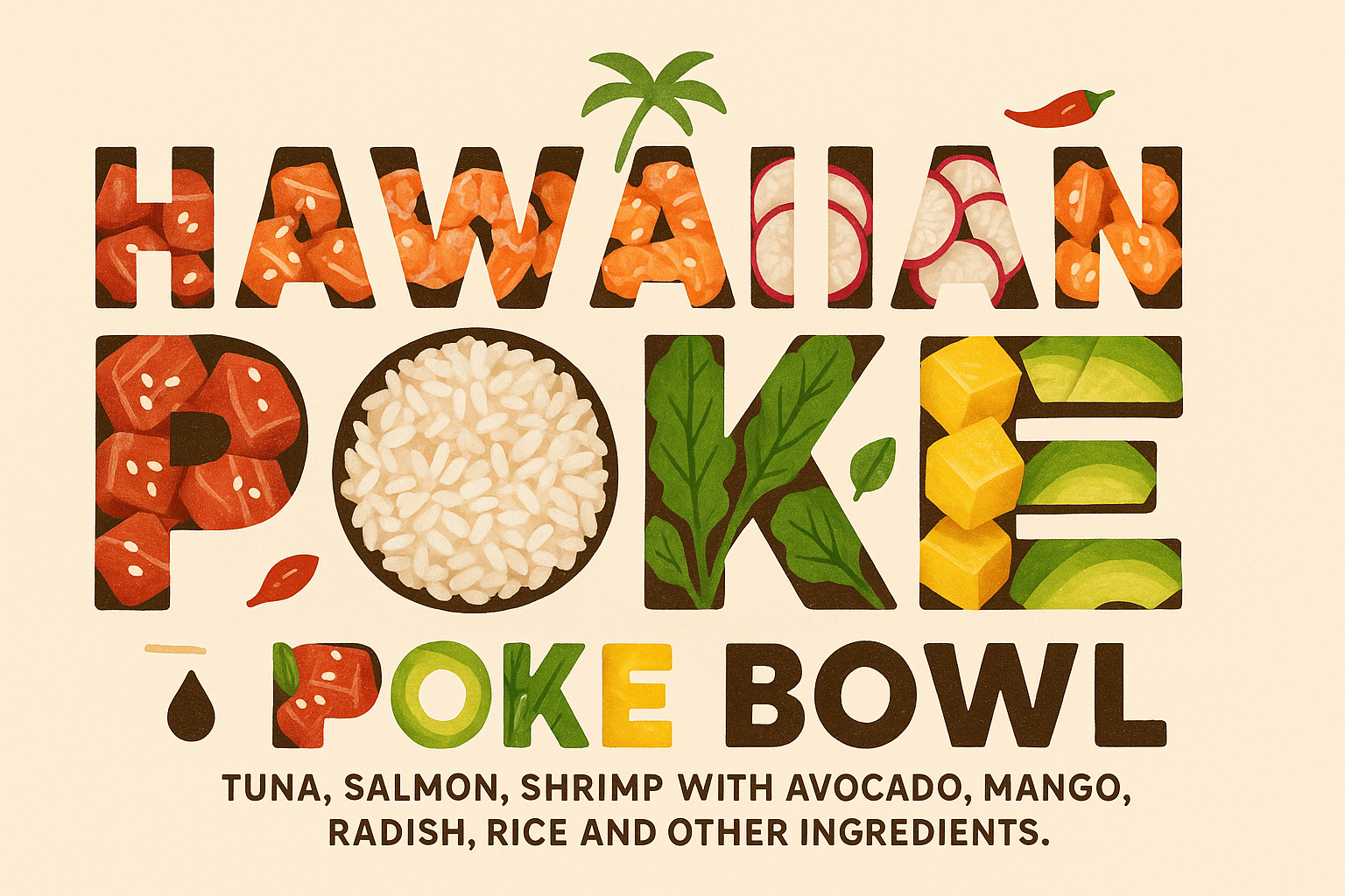 Colorful Hawaiian Poke Bowl Illustration with Ingredients