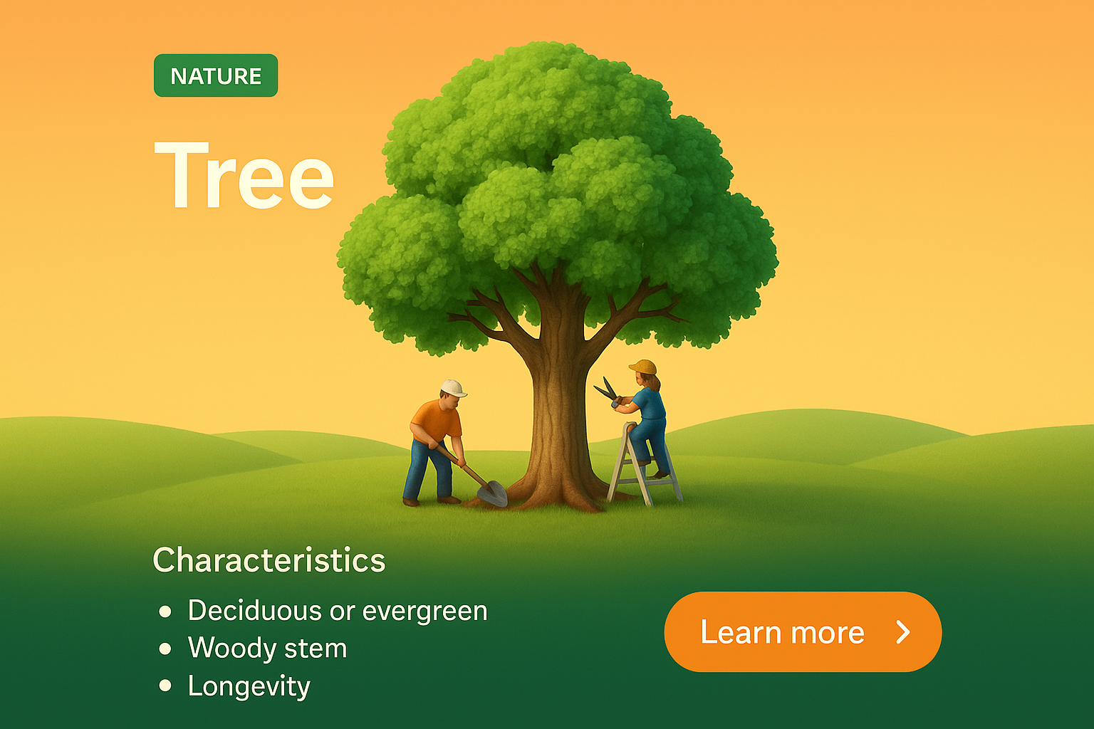 /Collection: /by davooda/Type: PNG/A vibrant 3D illustration depicting two small characters interacting with a tree in a serene environment. The scene features a gradient background, clear text, and a call-to-action button.