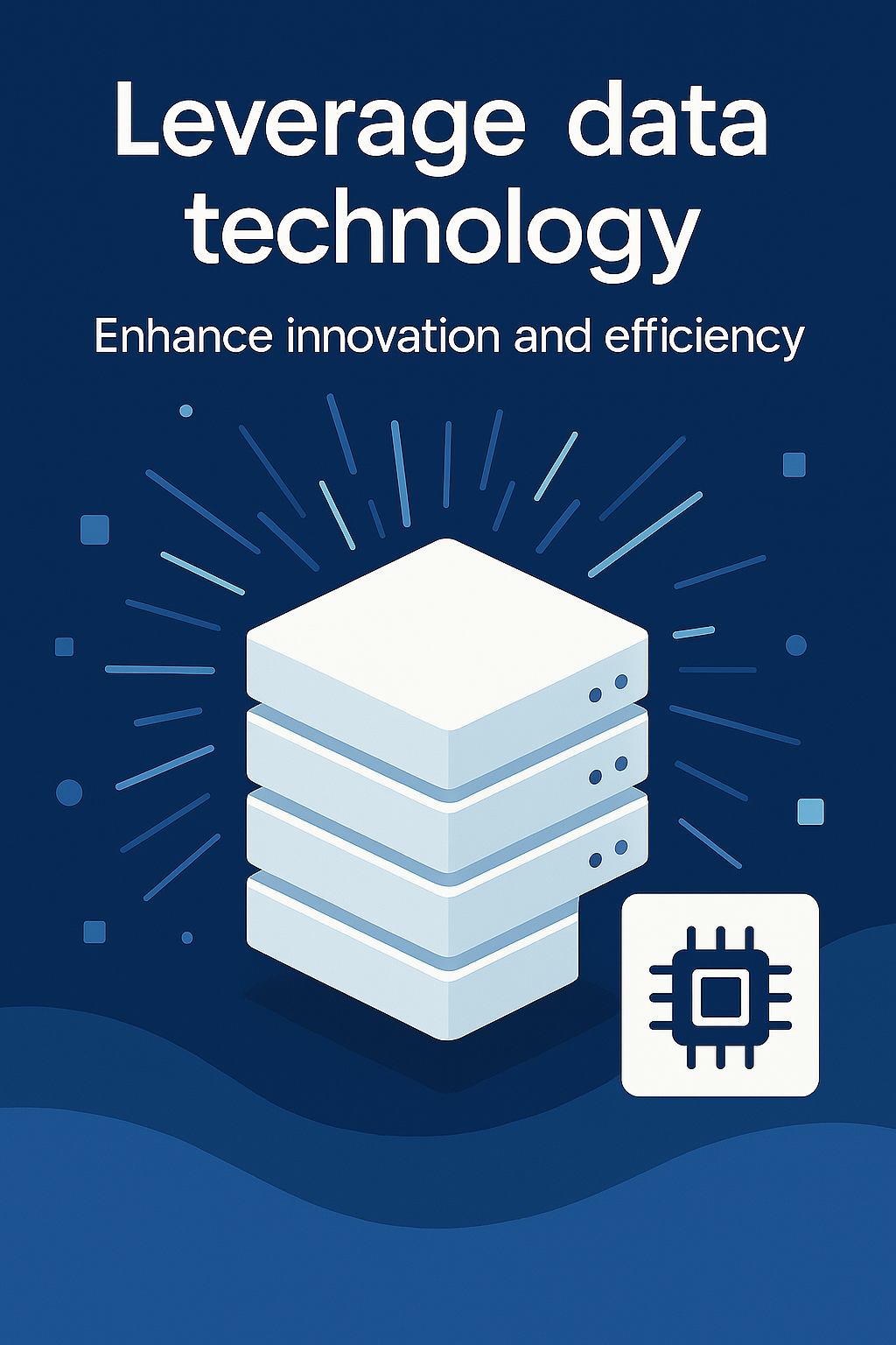 A modern graphic showcasing data technology concepts, featuring stylized server illustrations and a chip icon. Ideal for tech marketing and informational use.