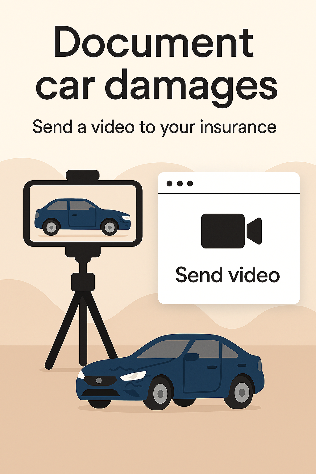 /Collection: /by davooda/Type: PNG/Informative graphic illustrating the process of documenting car damages using video for insurance purposes. The design features a camera setup and a visual representation of a car, aimed at guiding users.