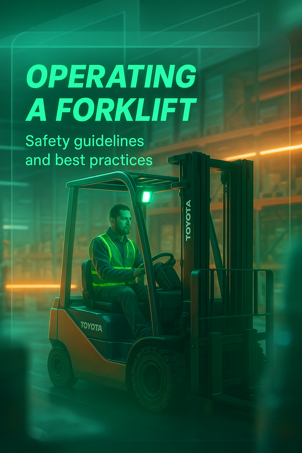 /Collection: /by davooda/Type: PNG/Informative infographic showcasing safety guidelines for operating a forklift, featuring a worker in a warehouse environment with a modern design style ideal for training materials.