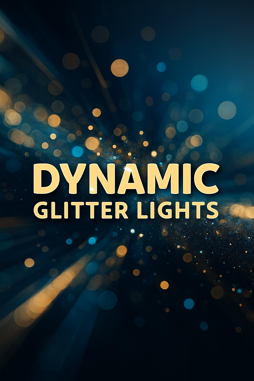 An abstract background featuring dynamic glitter lights in blue and gold, with a blurred bokeh effect. The composition highlights the word 'DYNAMIC' in bold, creating an elegant and festive feel.