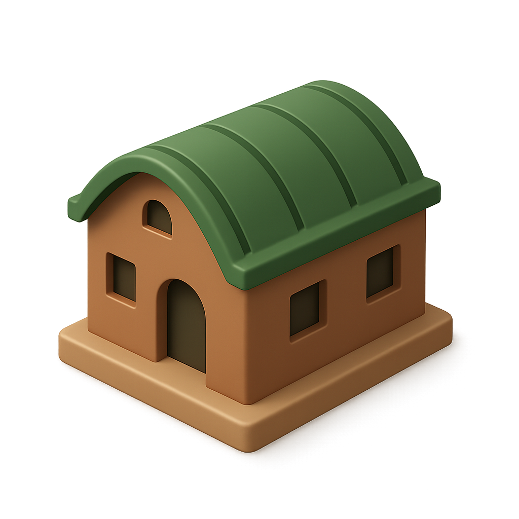A three-dimensional icon of a barracks, featuring a green roof and brown walls, presented in an isometric view with a soft gradient background, emphasizing its volumetric design.
