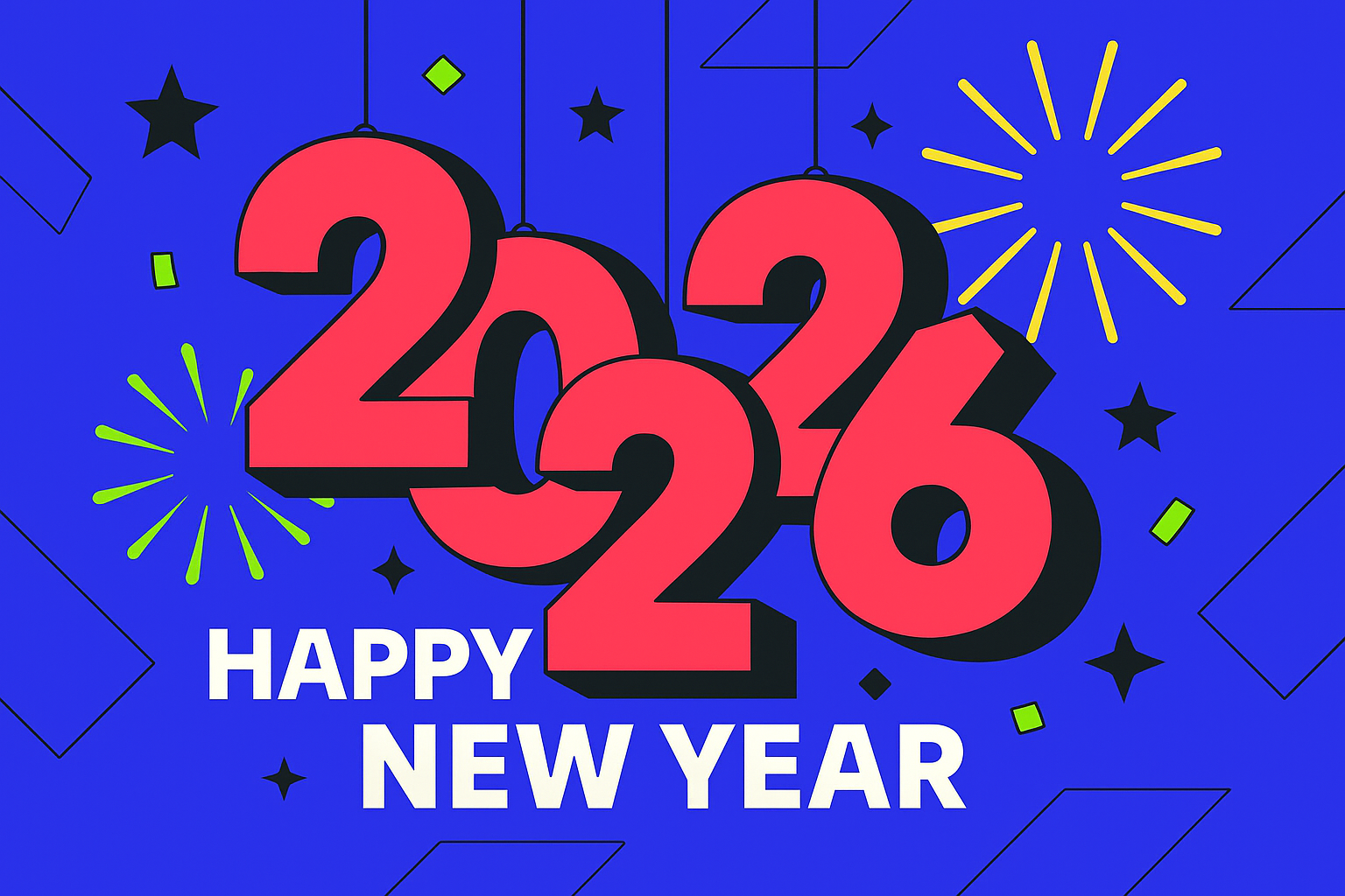 Dynamic 3D graphic celebrating New Year 2026, featuring bold typography and colorful fireworks. Clean geometric shapes and bright contrasts create an engaging festive atmosphere.