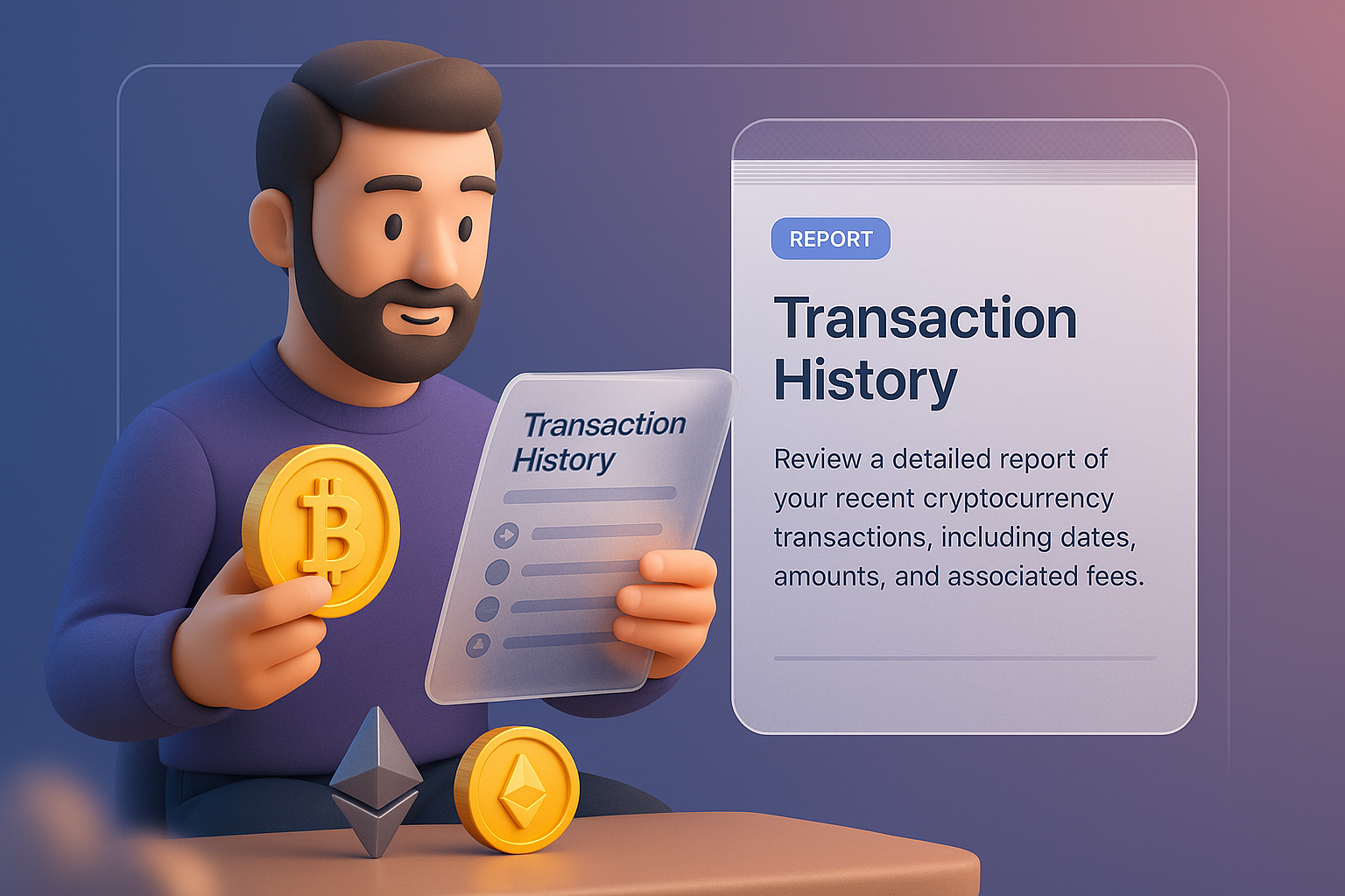 /Collection: /by davooda/Type: PNG/A 3D character examines a cryptocurrency transaction history report, holding gold and silver coins. The design features a gradient background and a modern info block.