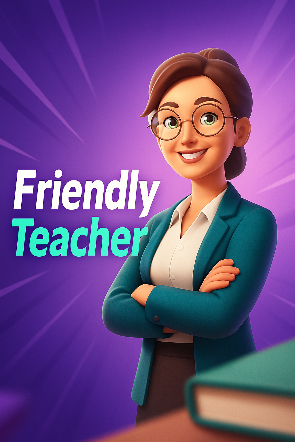 /Collection: /by davooda/Type: PNG/A vibrant illustration of a smiling female teacher with glasses, arms crossed, set against a dynamic gradient background. The title 'Friendly Teacher' is prominently displayed, embodying a professional yet engaging aesthetic.