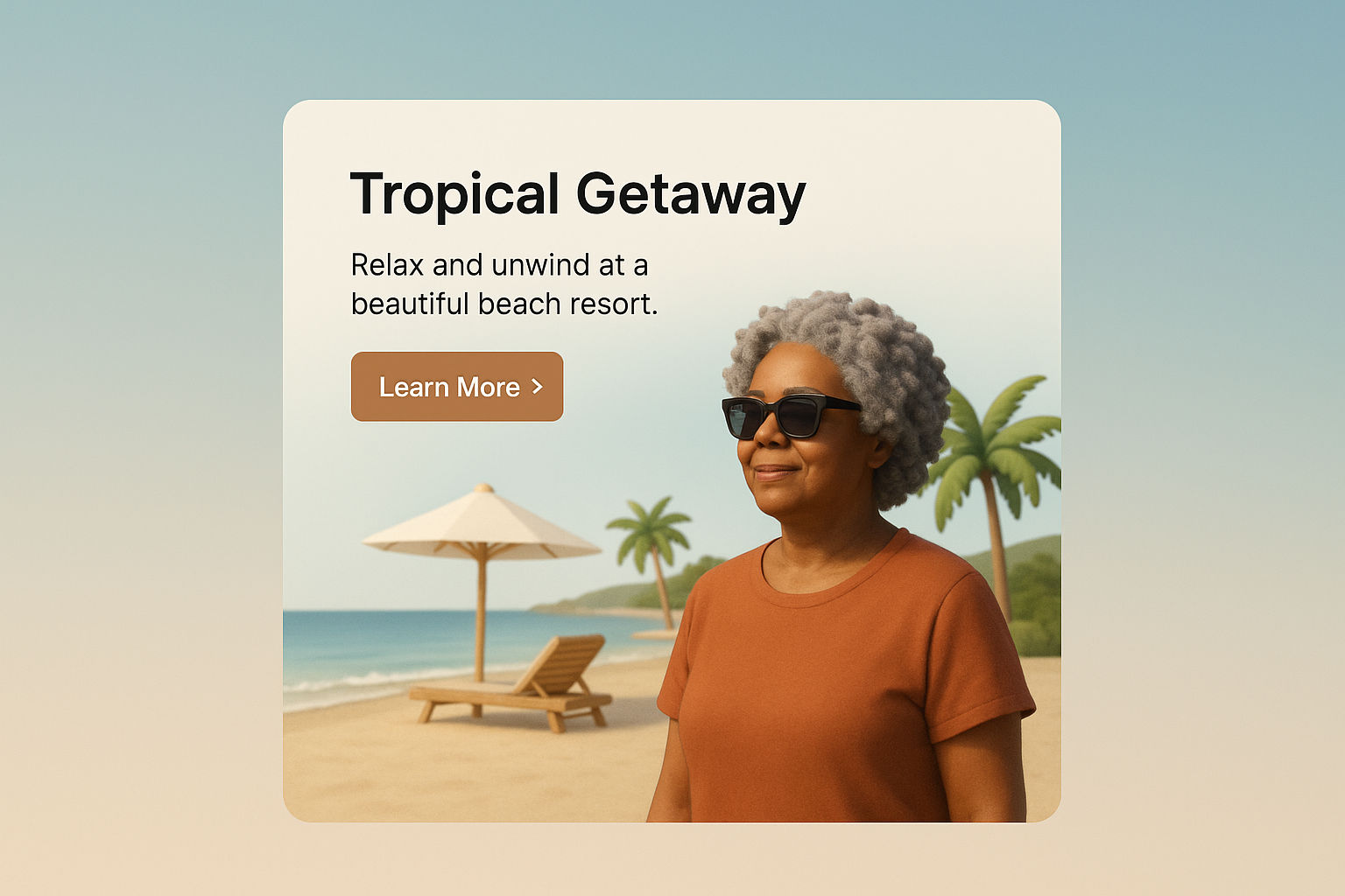 A lifestyle portrait of a mature black woman with curly gray hair and sunglasses, set against a tropical beach resort background. She stands confidently, exuding relaxation and enjoyment.