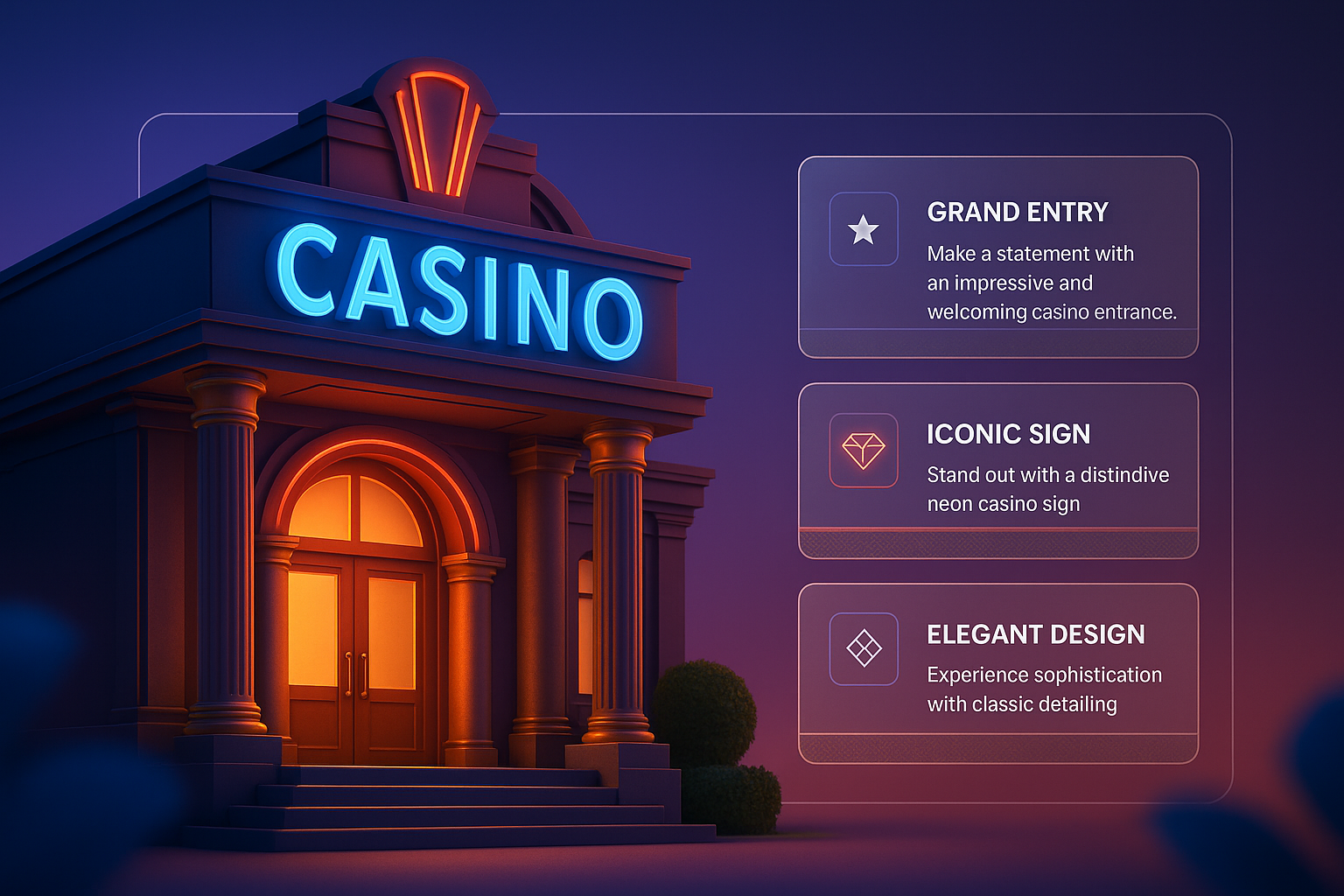 /Collection: /by davooda/Type: PNG/A captivating 3D illustration of a casino entrance featuring a vibrant neon sign. The design includes elegant detailing and a warm gradient background, enhancing the visual appeal.