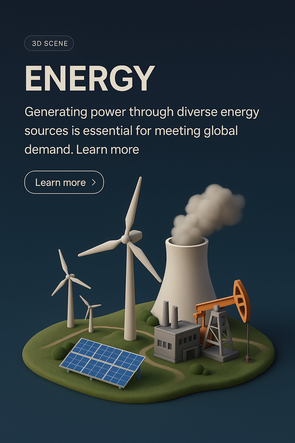 /Collection: /by davooda/Type: PNG/A detailed 3D illustration showcasing various energy sources, including wind turbines, solar panels, and a power plant. The scene is designed with a dark gradient background, highlighting the importance of diverse energy generation.