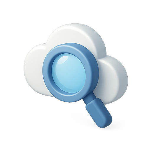 A modern 3D icon featuring a cloud shape with a magnifying glass, ideal for cloud computing or search-related applications. The design combines simplicity with a clean and professional aesthetic.
