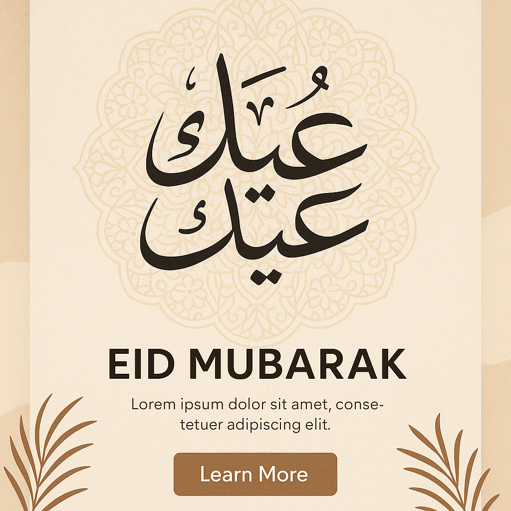 This image features elegant Arabic calligraphy of 'Eid Mubarak' on a light background with an intricate Islamic pattern, complemented by a clean layout and a call-to-action button.