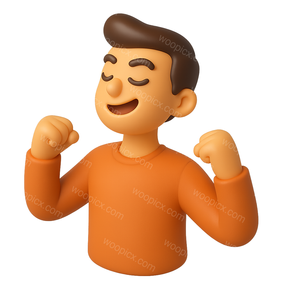/Premium/Collection: /by davooda/Type: PNG/This image showcases a 3D character with a joyful expression, flexing their arms in a triumphant pose. The character wears an orange shirt and is set against a softly glowing background, enhancing the three-dimensional feel.