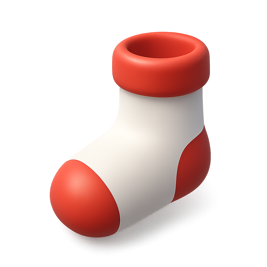 A stylized 3D representation of a sock, featuring a smooth, rounded design with red and white colors. The icon showcases a three-quarter view with a transparent background.