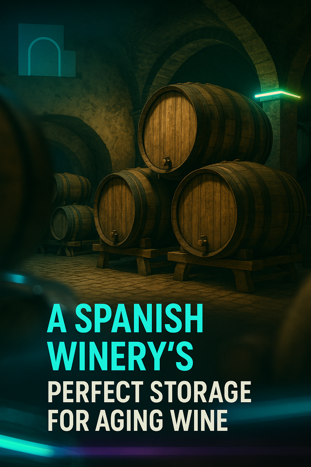 A visually appealing image of a rustic wine cellar showcasing wooden barrels, ideal for marketing wine storage solutions or winery experiences.