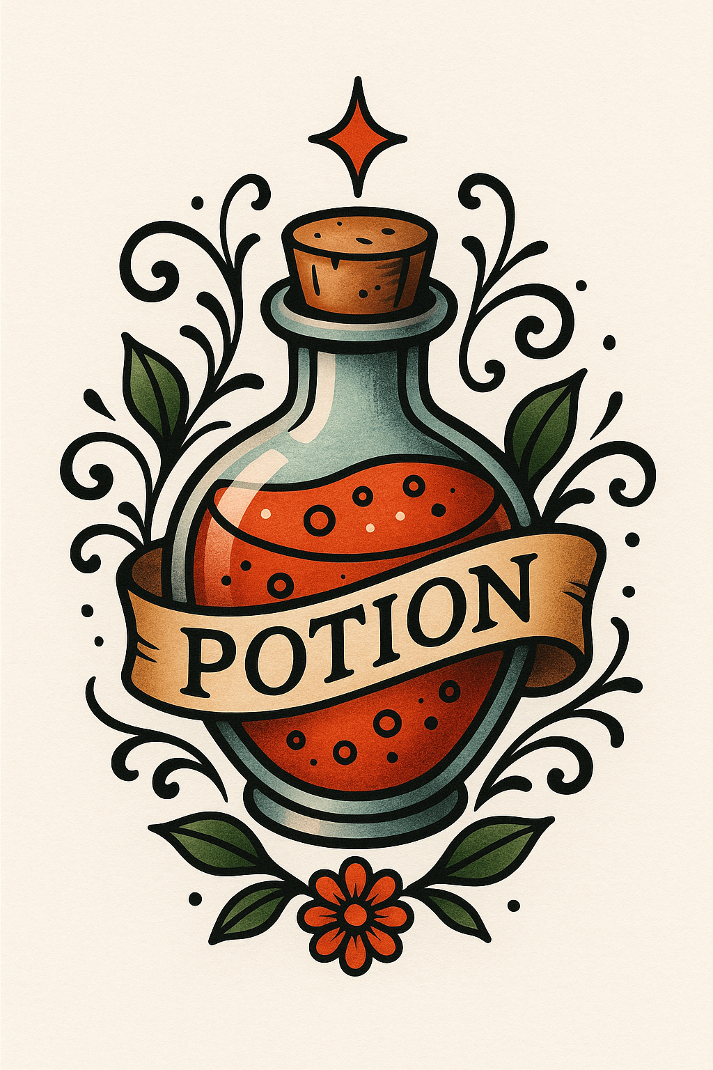 Vibrant illustration of a potion bottle surrounded by decorative elements and floral designs, perfect for fantasy-themed projects or merchandise.