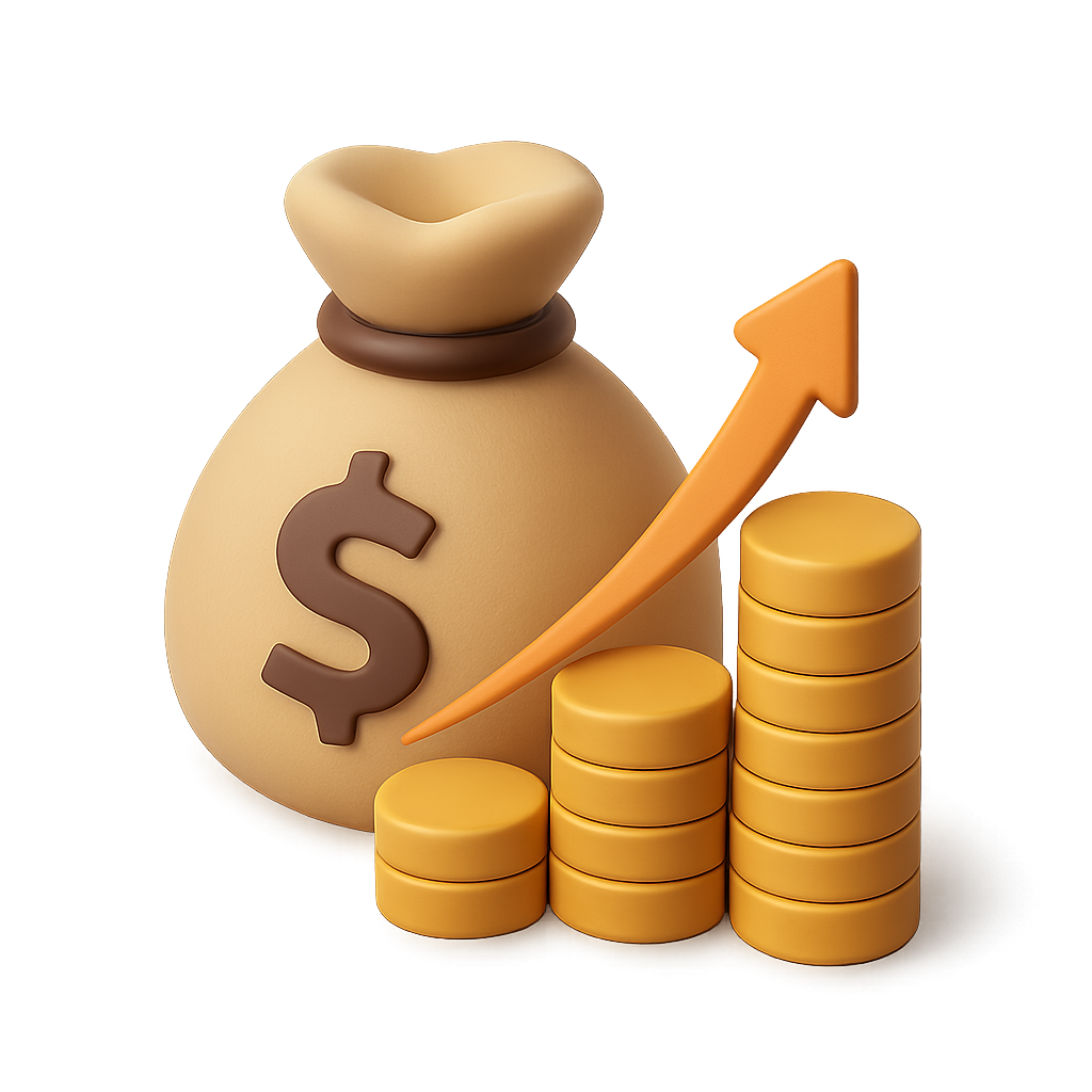 A visually appealing 3D icon featuring a money bag and stacked coins, symbolizing financial growth. The design showcases a transparent background and a three-quarter isometric view.