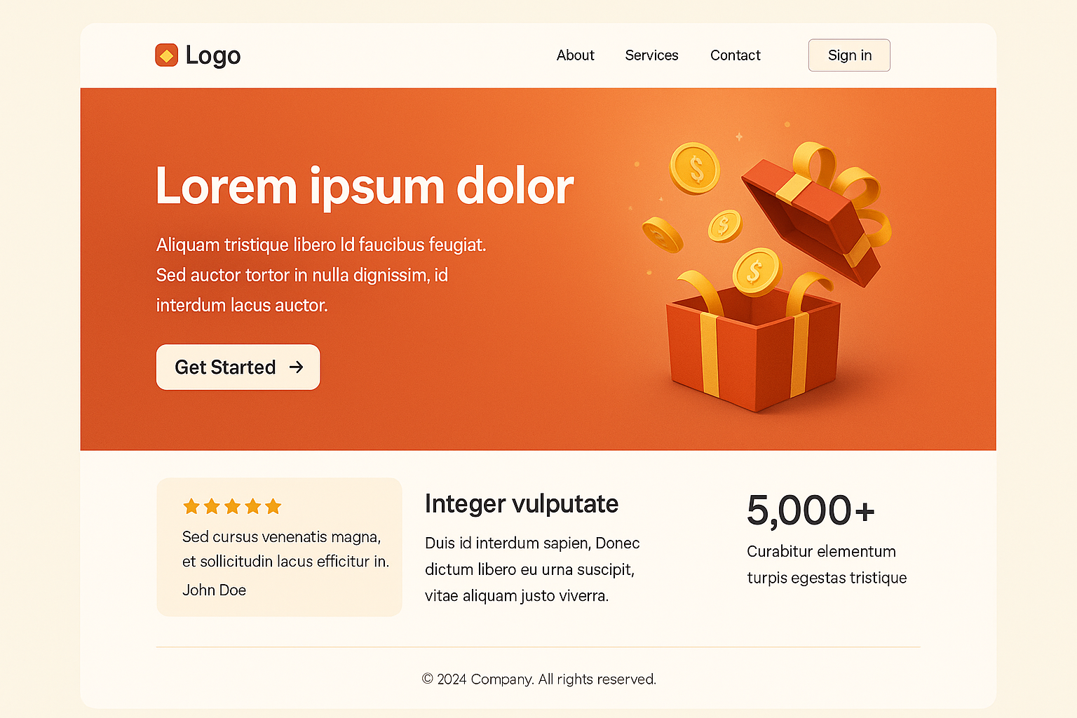 A visually appealing modern landing page featuring a 3D gift box with coins, a tagline, and sections for testimonials, features, and statistics.