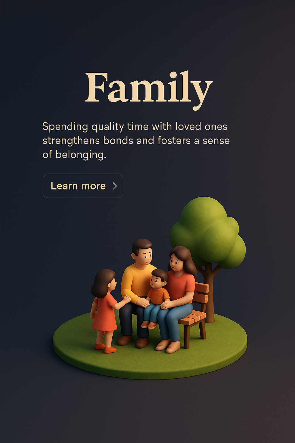 /Collection: /by davooda/Type: PNG/A detailed 3D scene depicting a family sitting on a bench in a serene environment. The design features vibrant colors against a dark gradient background, highlighting the theme of togetherness.