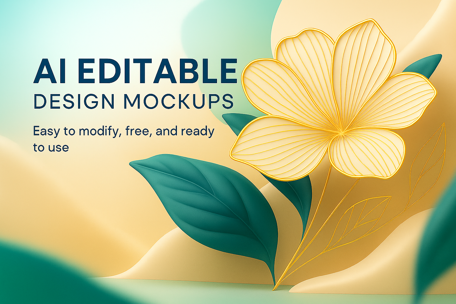 This image showcases AI editable design mockups featuring a stylized flower and leaves, highlighting their ease of modification and readiness for use.