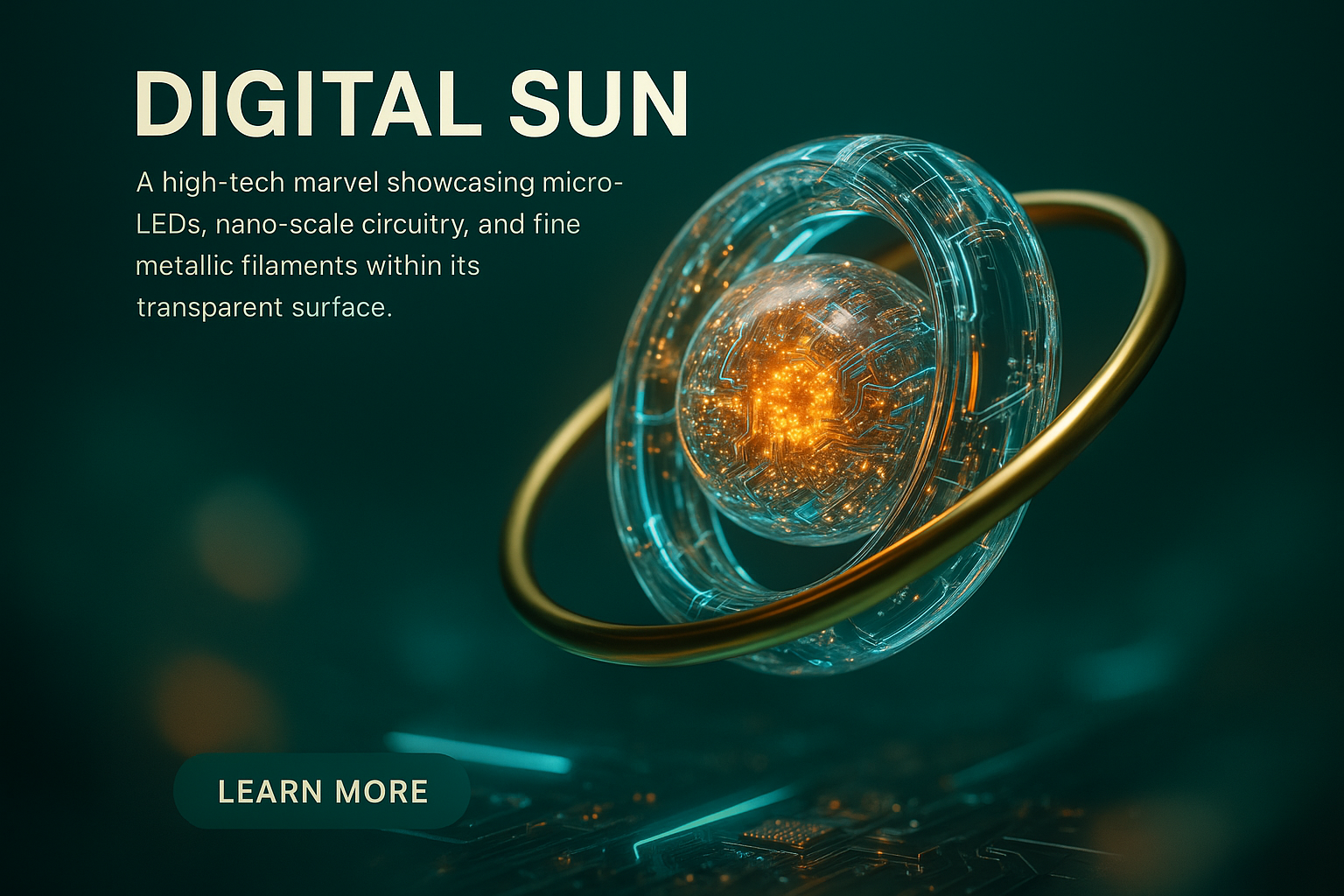 /Collection: /by davooda/Type: PNG/A stunning hyperrealistic depiction of a golden ring orbiting a digital sun, featuring intricate micro-LEDs and metallic filaments. The scene is illuminated with neon accents and deep colors.