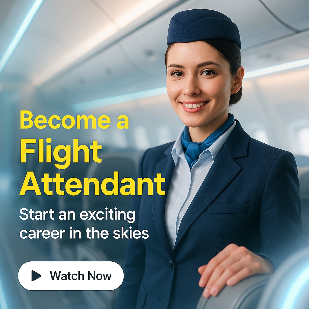 /Collection: /by davooda/Type: PNG/Engaging promotional graphic aimed at attracting individuals to a flight attendant career, featuring a smiling professional in uniform set against an airplane interior background.