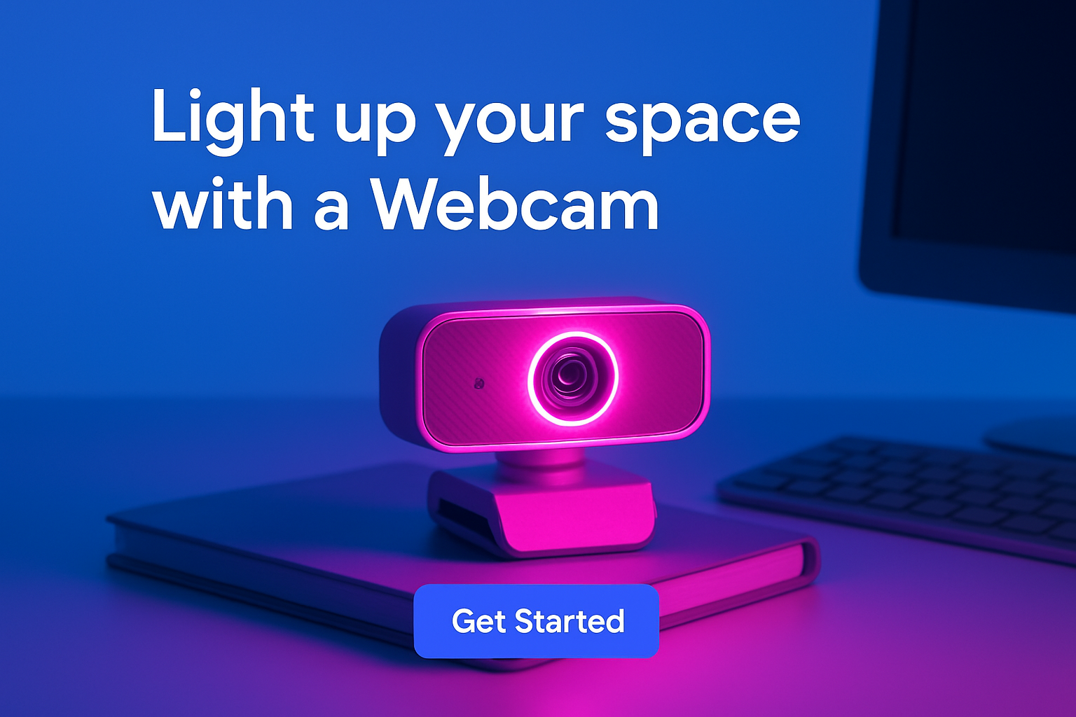 A glowing webcam emits a neon-pink light, illuminating its surroundings with cool shades of blue and violet. The solid blue background enhances the vibrant atmosphere.