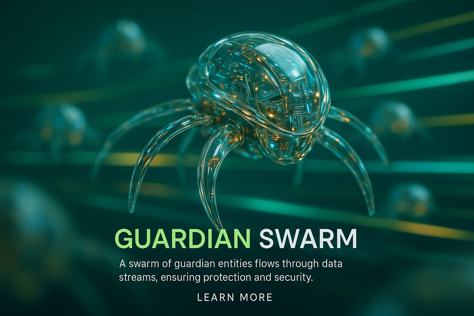 /Collection: /by davooda/Type: PNG/A hyperrealistic depiction of a swarm of guardian entities, sculpted from glass-like polymers, showcasing glowing micro-LEDs and intricate mechanical components. The design emphasizes depth with blurred foreground elements.