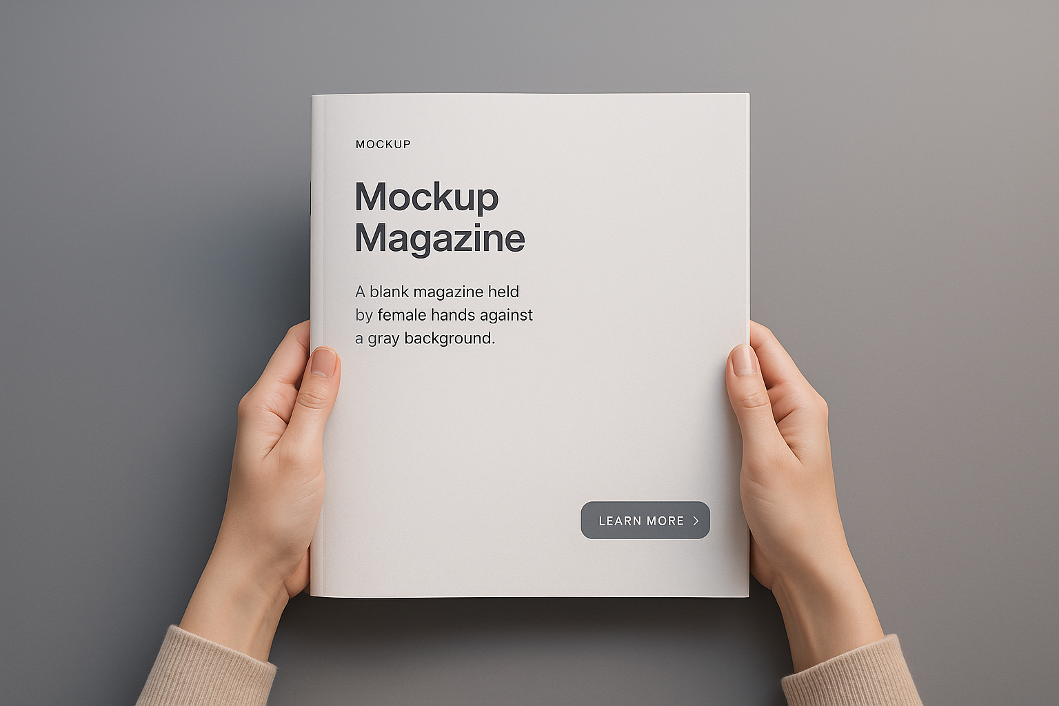 /Collection: /by davooda/Type: PNG/A mockup image showcasing female hands holding a blank magazine with a clean design. The gray background enhances the minimalistic aesthetic, creating a professional look.
