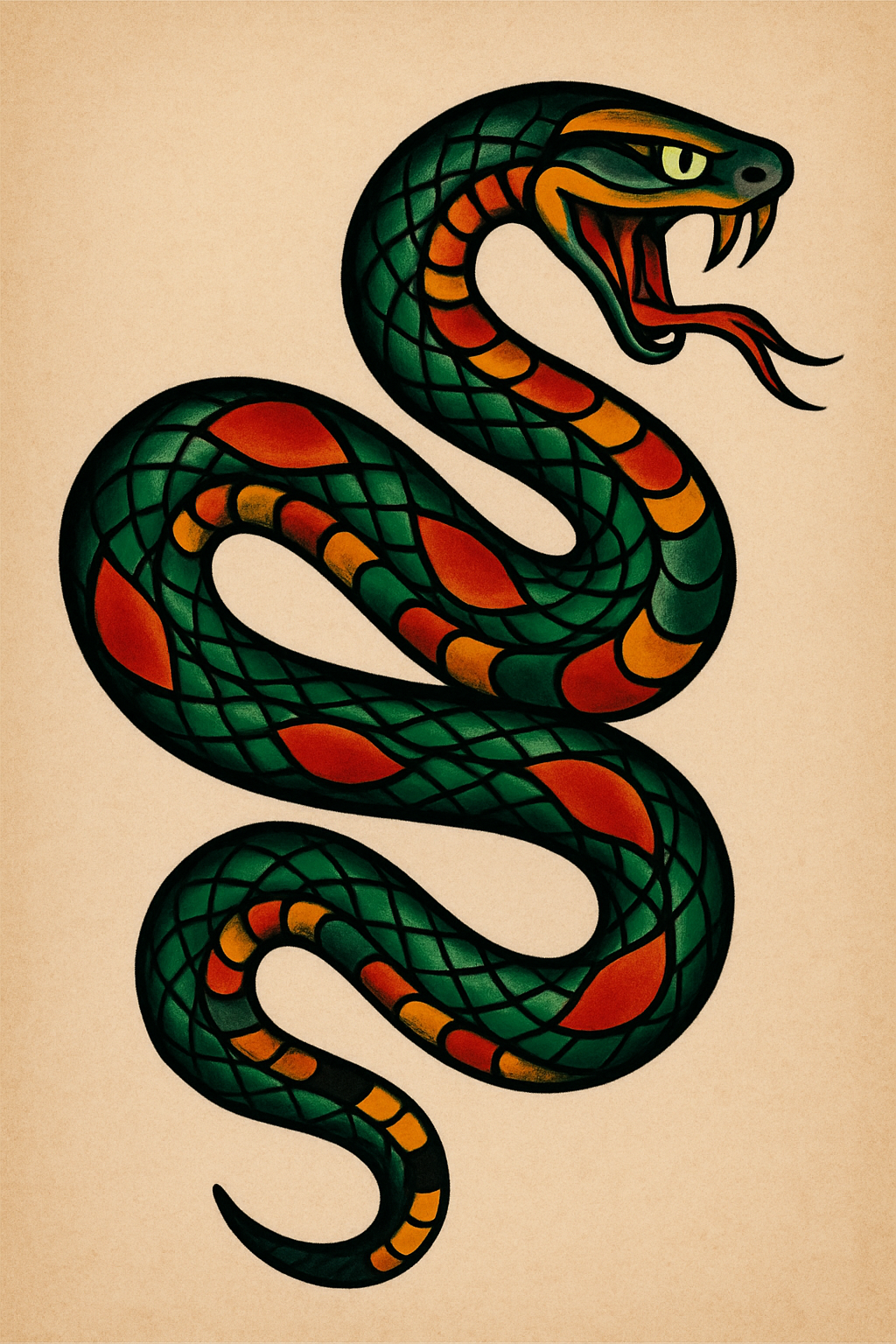 Vintage Tattoo Design with Skull, Snake, and Rose