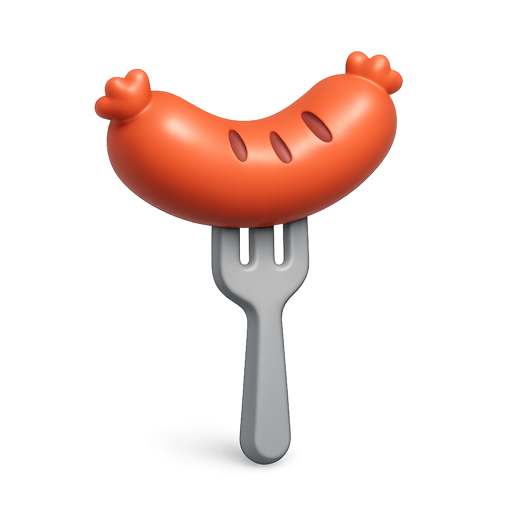 A stylized 3D icon of a sausage on a fork, presented in a three-quarter view with a modern, volumetric design against a blurred background.