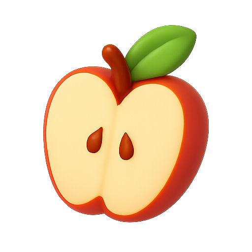 A colorful 3D rendering of a stylized apple with a cut-out effect, featuring a vibrant red exterior and a green leaf. Ideal for food-related graphics or educational materials.