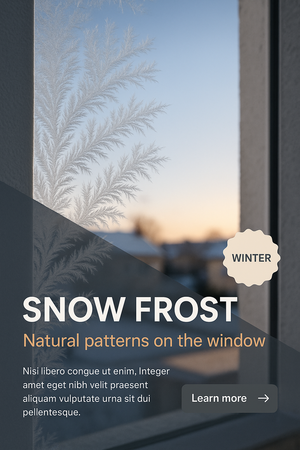 This image showcases intricate snow frost patterns on a window, with a soft morning sky in the background. The composition features layered elements that enhance the tranquil winter scene.