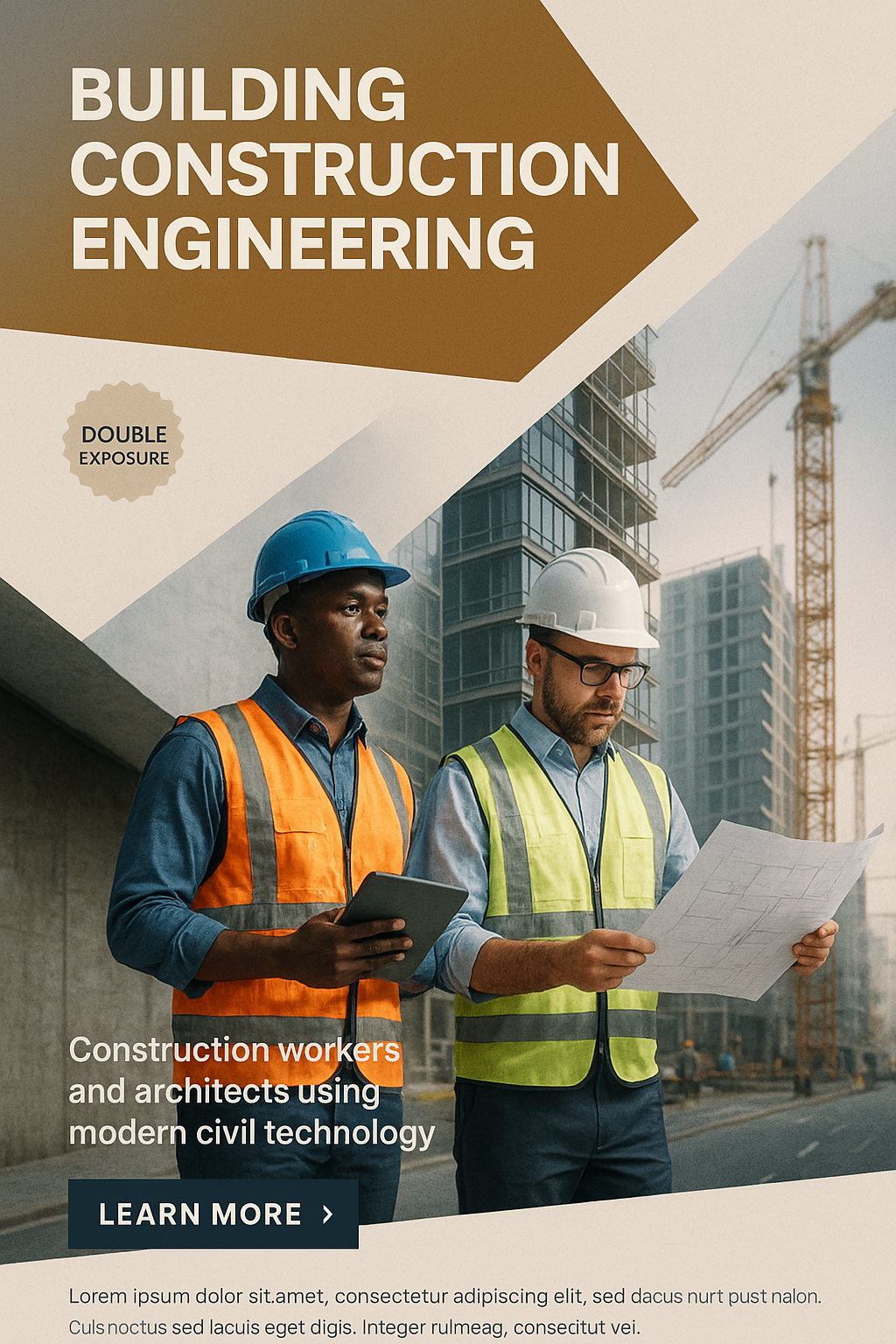 /Collection: /by davooda/Type: PNG/A digital illustration showcasing construction workers and architects using modern technology. The design features a double exposure effect, layered composition, and a professional aesthetic.