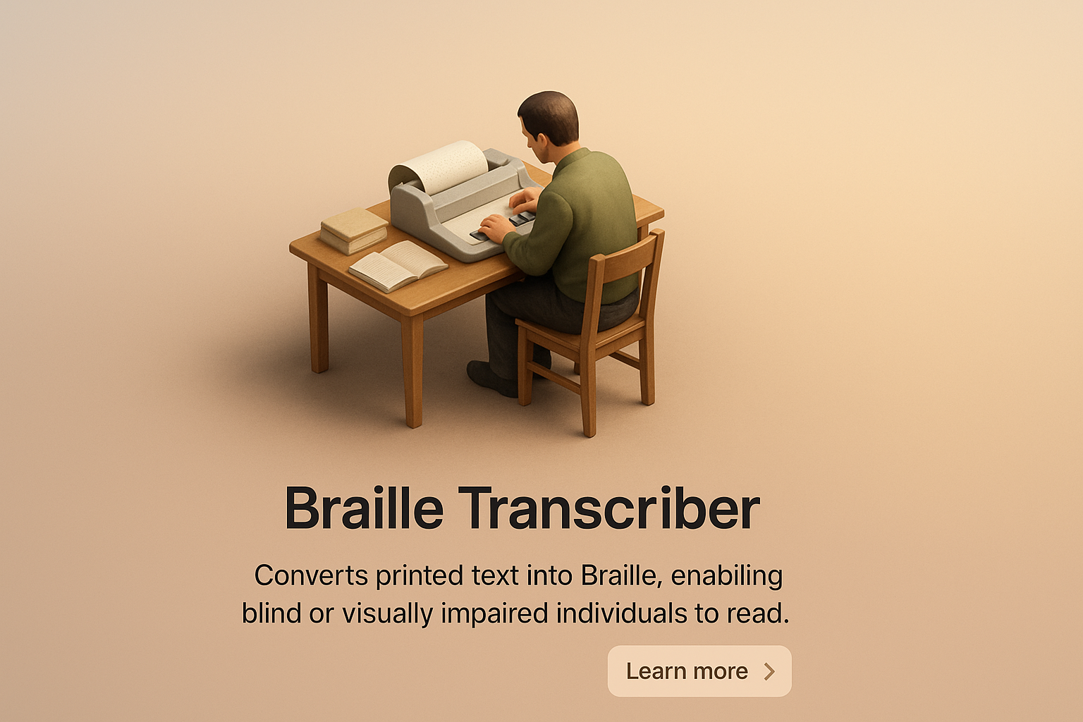 /Collection: /by davooda/Type: PNG/A detailed 3D representation of a Braille transcriber at work, showcasing a person using the machine in a minimalist environment. The scene is zoomed out to capture the context.