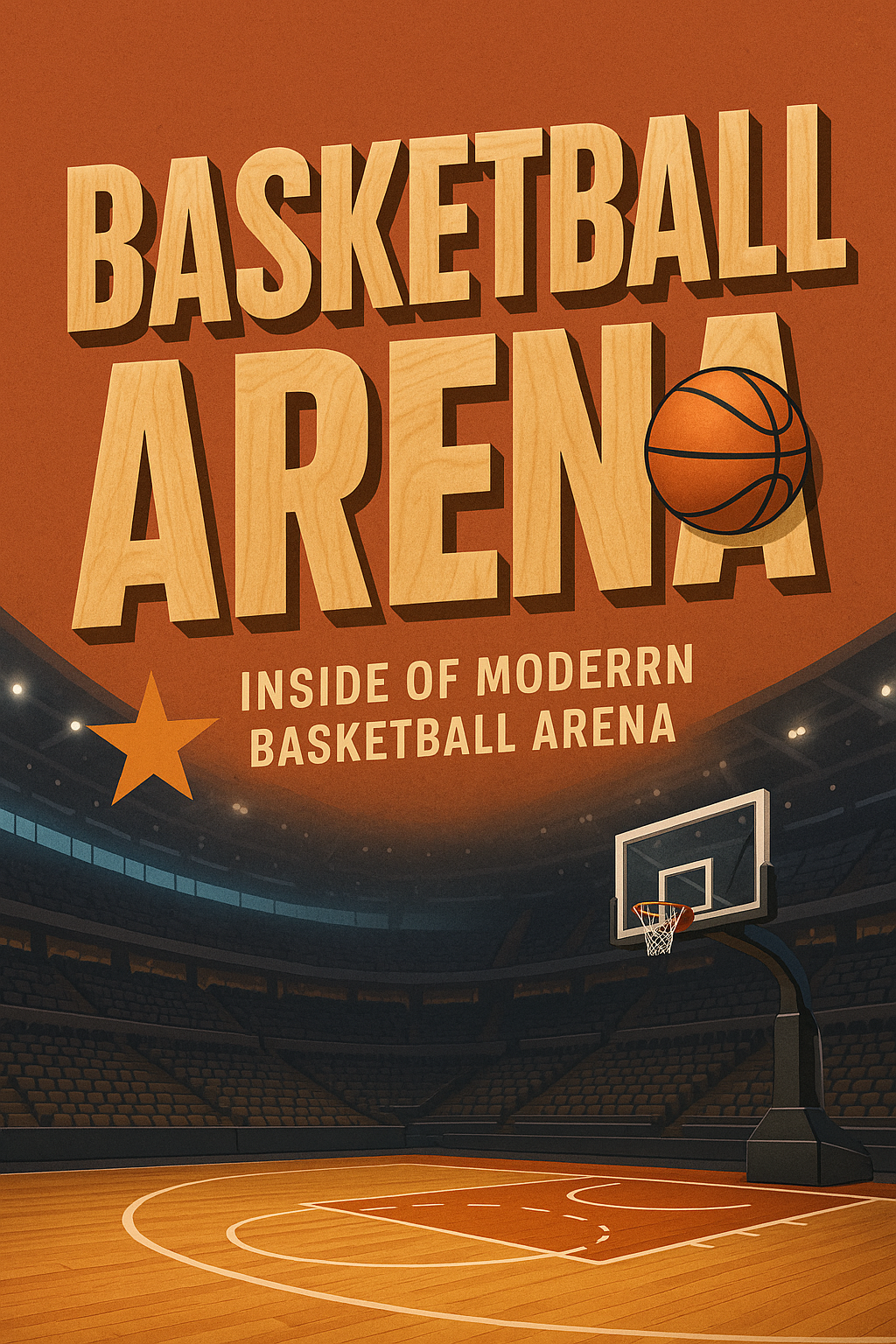/Collection: /by davooda/Type: PNG/Illustrative graphic showcasing a modern basketball arena theme with bold wooden typography. Ideal for sports marketing, event promotions, or team branding.