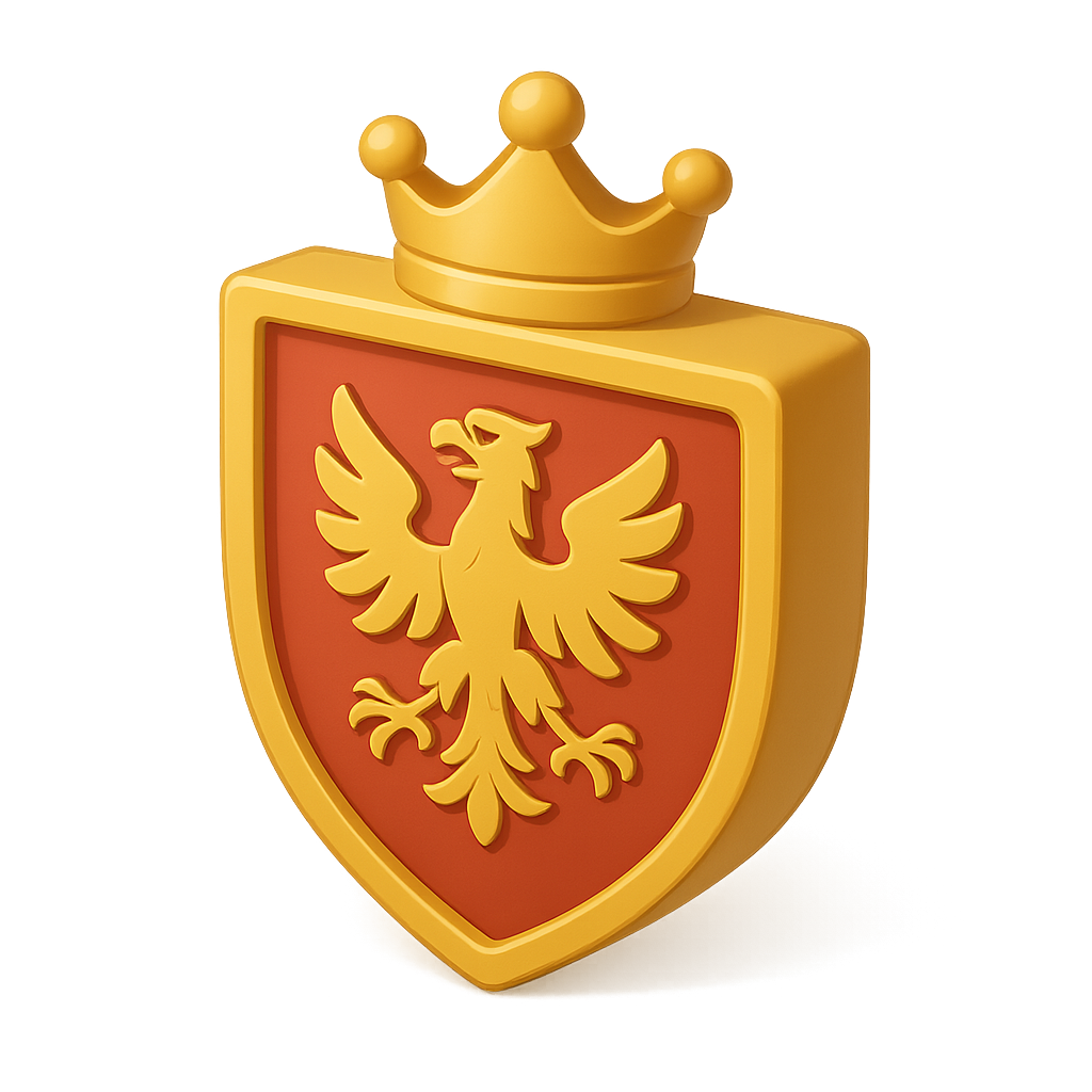 A vibrant 3D icon featuring a golden shield adorned with a red background and a regal eagle, topped with a crown, symbolizing strength and nobility.