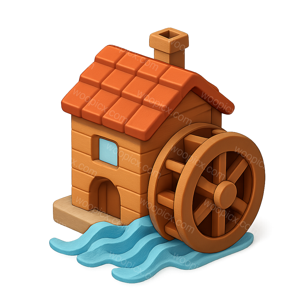 /Premium/Collection: /by davooda/Type: PNG/A colorful 3D icon depicting a quaint house with a water wheel, surrounded by flowing water. The warm tones and playful design make it visually appealing.