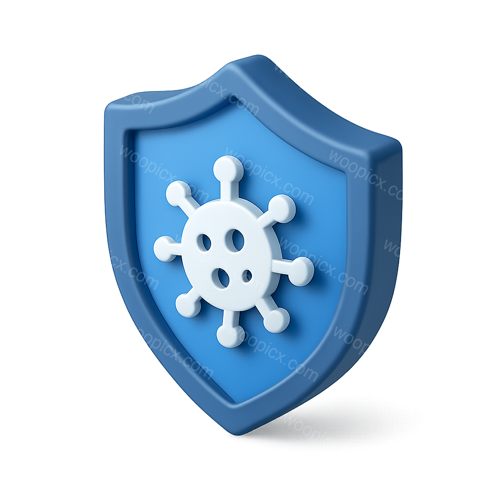 A visually appealing 3D antivirus shield icon featuring a blue shield with a white virus symbol. Designed with a three-quarter view, it showcases a modern, isometric style.