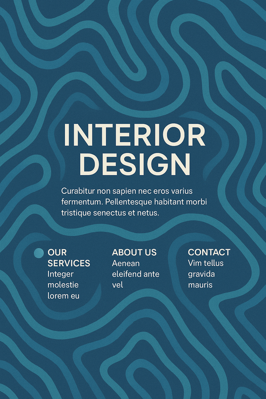 Stylish interior design promotional poster featuring a modern abstract wave pattern, suitable for showcasing design services and contact information.