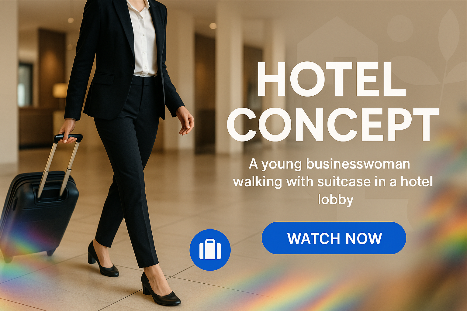 An elegant image featuring a young businesswoman walking with a suitcase in a hotel lobby, ideal for travel and hospitality marketing. The modern design complements professional themes.