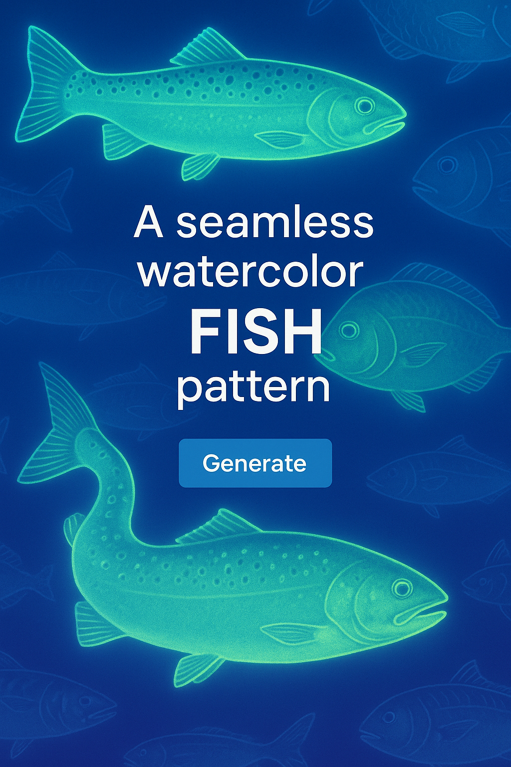 A seamless pattern featuring watercolor fish like trout, salmon, and mackerel on a solid blue background. The design includes glowing light lines that enhance the fish's vibrant colors.