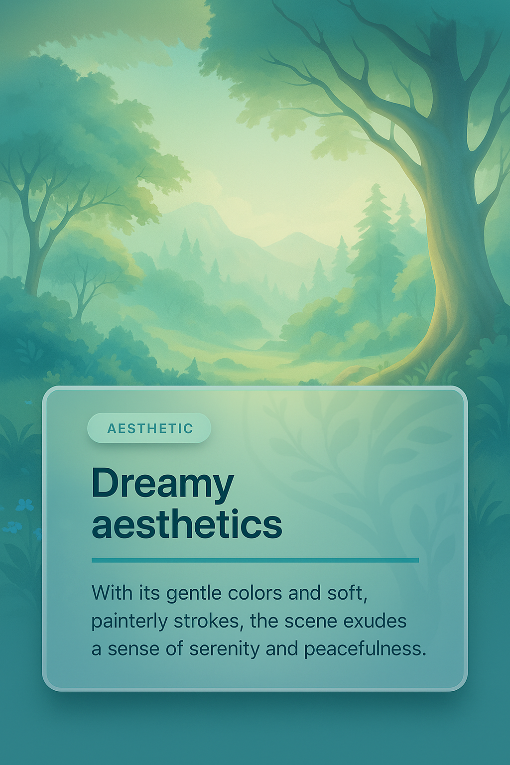 A serene forest landscape featuring gentle colors and soft painterly strokes. The artwork evokes tranquility, complemented by an aesthetic text block.