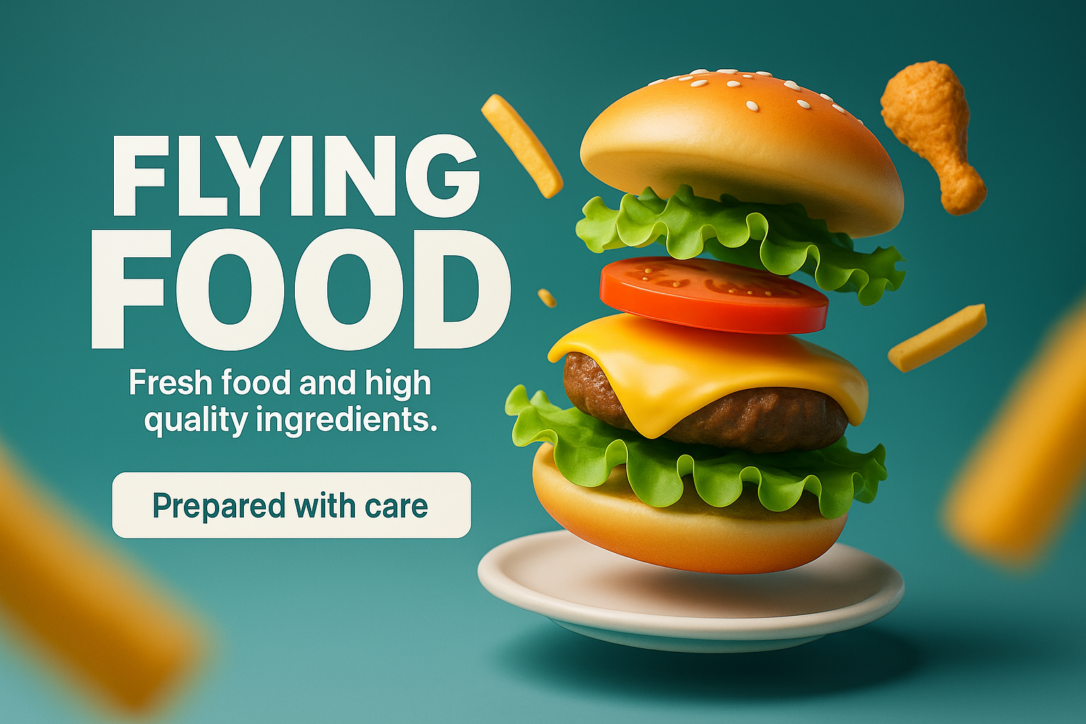 A vibrant 3D representation of a flying burger stacked with fresh ingredients, accompanied by fries. The clean background enhances the focus on the food.