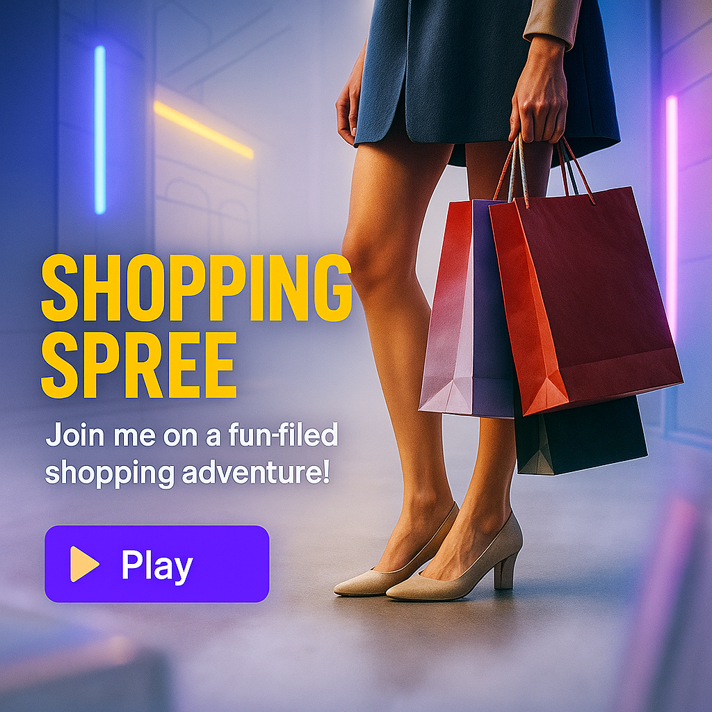 /Collection: /by davooda/Type: PNG/Vibrant promotional image inviting viewers to join a shopping adventure, featuring stylish shopping bags and a call-to-action play button, ideal for social media or ads.