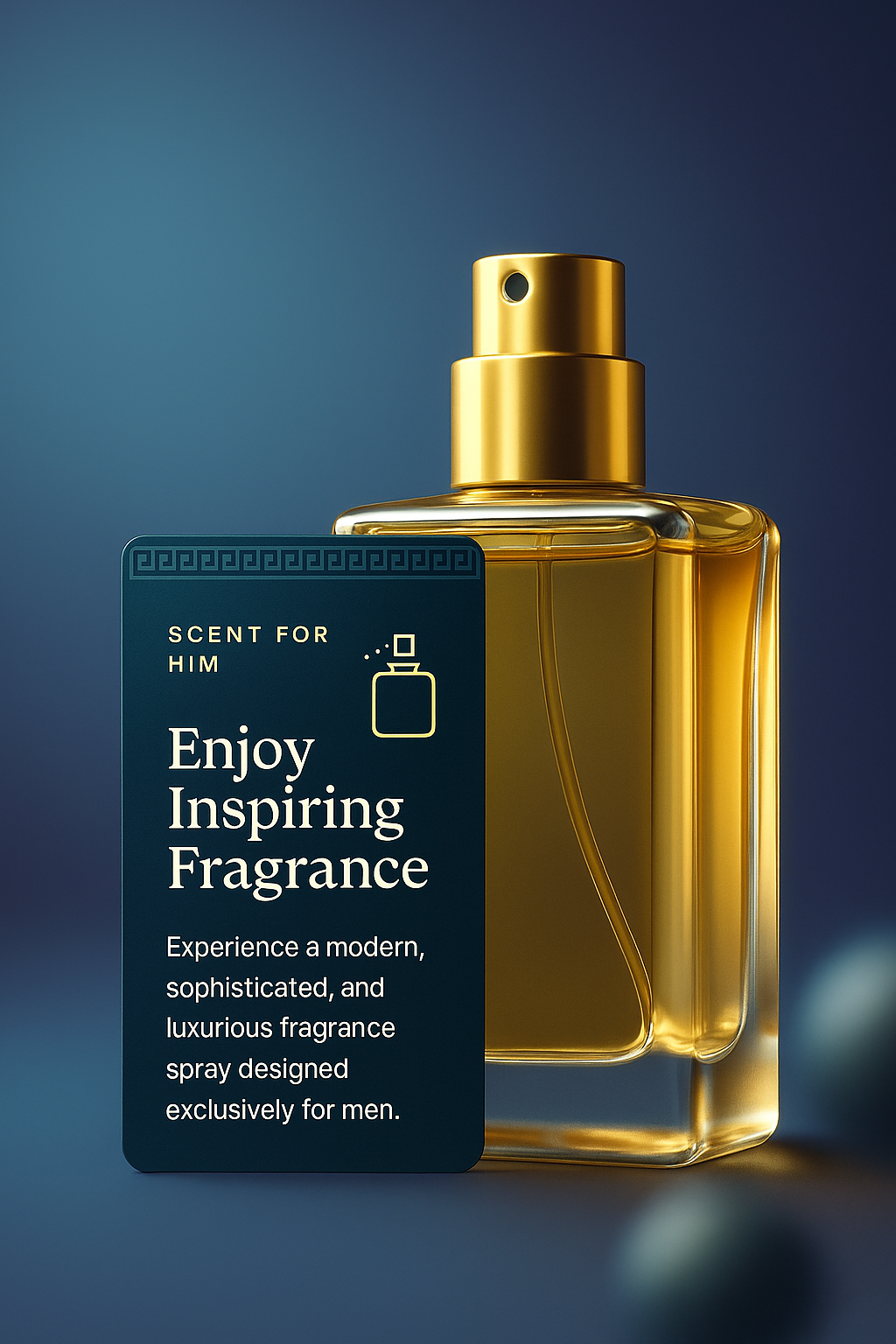 /Collection: /by davooda/Type: PNG/A luxurious gold glass bottle of men's eau de parfum stands prominently against a smooth dark background. The design features a modern spray nozzle and elegant label.