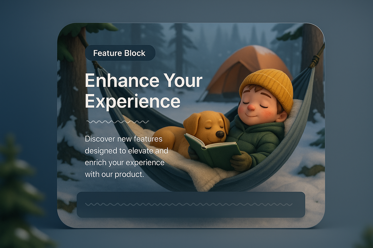 A cozy scene of a child reading a book with a dog in a hammock, set in a winter forest. The backdrop features a tent, creating a warm camping atmosphere.
